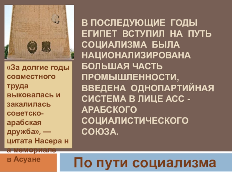 «За долгие годы совместного труда выковалась и закалилась советско-арабская дружба», — цитата Насера на мемориале в Асуане