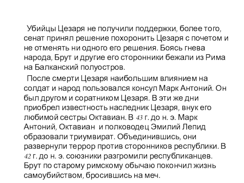 Цезаря с почетом и не отменять ни одного его решения. Боясь гнева народа, Брут и другие его сторонники бежали из Рима на Балканский полуостров.