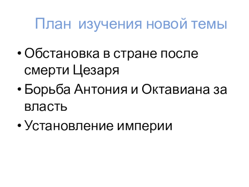 План изучения новой темыОбстановка в стране после смерти Цезаря Борьба Антония и Октавиана за властьУстановление империи