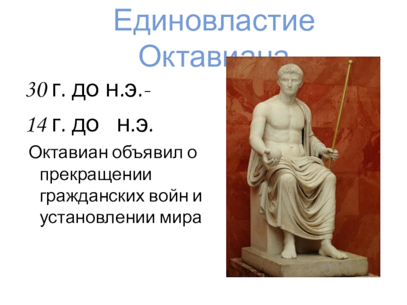 Единовластие Октавиана30 г. до н.э.-14 г. до  н.э. Октавиан объявил о прекращении гражданских войн и установлении