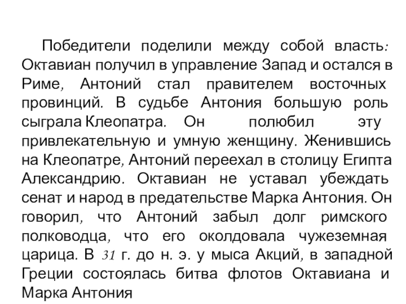 остался в Риме, Антоний стал правителем восточных провинций. В судьбе Антония большую роль сыграла Клеопатра. Он полюбил эту привлекательную и умную женщину. Женившись на Клеопатре, Антоний переехал в столицу Египта Александрию. Октавиан не уставал убеждать сенат и народ в предательстве Марка Антония. Он говорил, что Антоний забыл долг римского полководца, что его околдовала чужеземная царица. В 31 г. до н. э. у мыса Акций, в западной Греции состоялась битва флотов Октавиана и Марка Антония