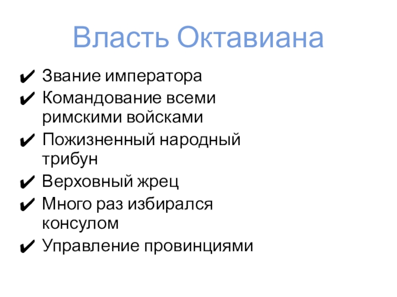 Власть Октавиана Звание императораКомандование всеми римскими войскамиПожизненный народный трибунВерховный жрецМного раз избирался консуломУправление провинциями