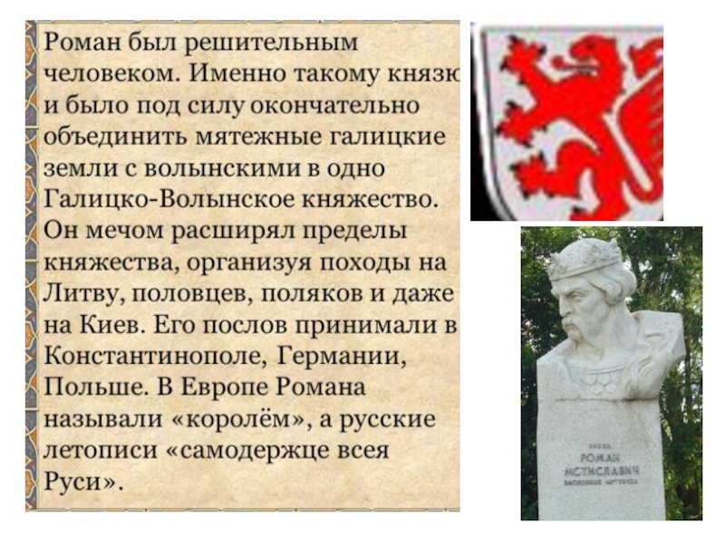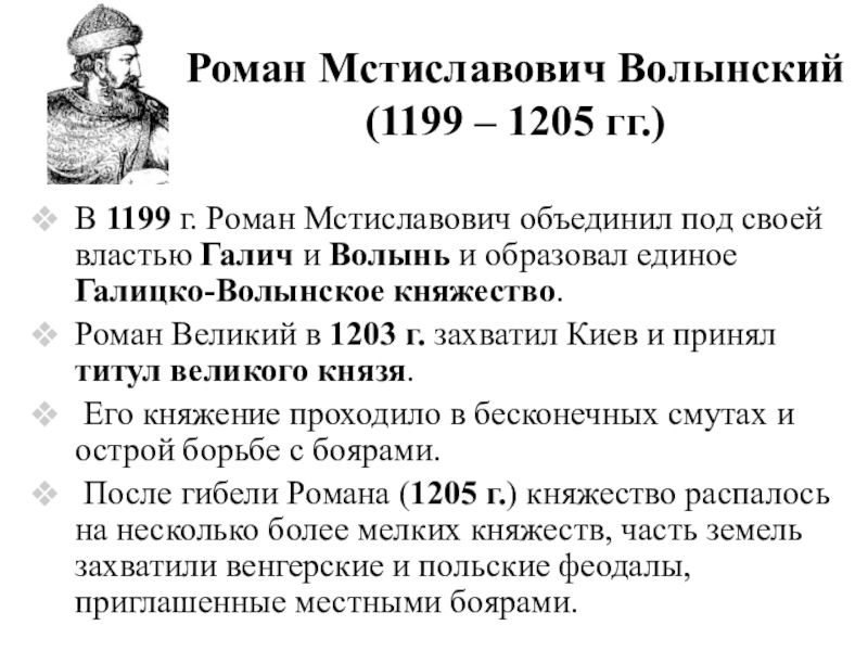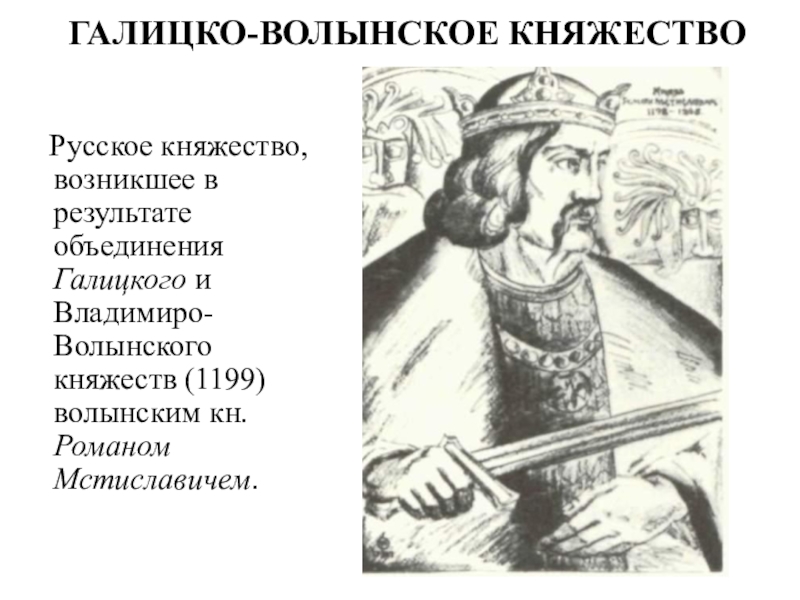 руках потомков Владимира Мономаха. Особенно ярко это проявилось при князе Романе Мстиславиче. Роман Мстиславич объединил под своей властью Галич и Волынь и образовал единое Галицко-Волынское княжество. Через несколько лет он присоединил к своим владениям и Киевское княжество.