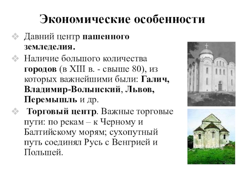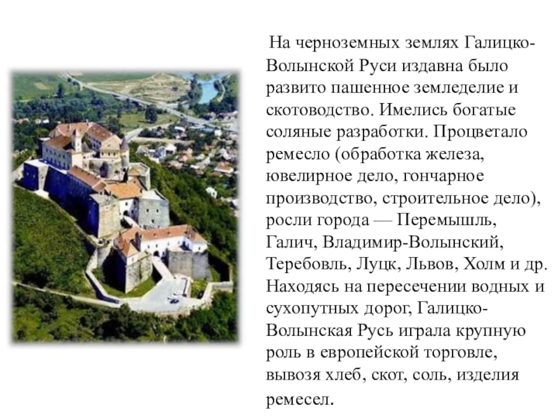 земледелие и скотоводство. Имелись богатые соляные разработки. Процветало ремесло (обработка железа, ювелирное дело, гончарное производство, строительное дело), росли города — Перемышль, Галич, Владимир-Волынский, Теребовль, Луцк, Львов, Холм и др. Находясь на пересечении водных и сухопутных дорог, Галицко-Волынская Русь играла крупную роль в европейской торговле, вывозя хлеб, скот, соль, изделия ремесел.