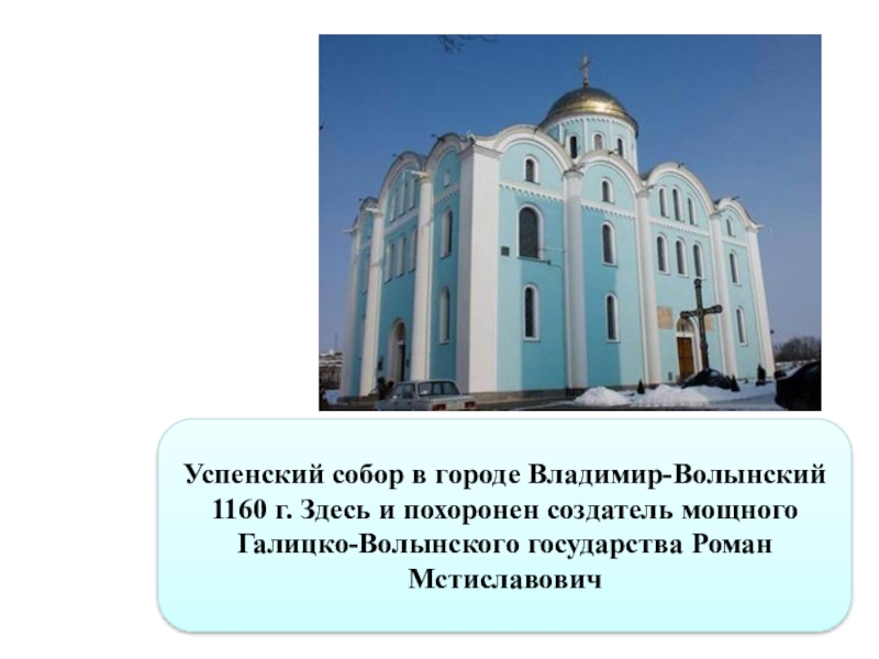 Слайд 63Успенский собор в городе Владимир-Волынский 1160 г. Здесь и похоронен создатель