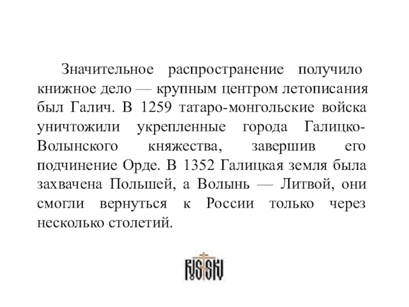 был Галич. В 1259 татаро-монгольские войска уничтожили укрепленные города Галицко-Волынского княжества, завершив его подчинение Орде. В 1352 Галицкая земля была захвачена Польшей, а Волынь — Литвой, они смогли вернуться к России только через несколько столетий.