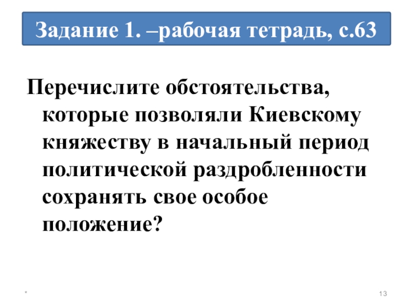 Слайд 13Перечислите обстоятельства, которые позволяли Киевскому княжеству в начальный период политической раздробленности