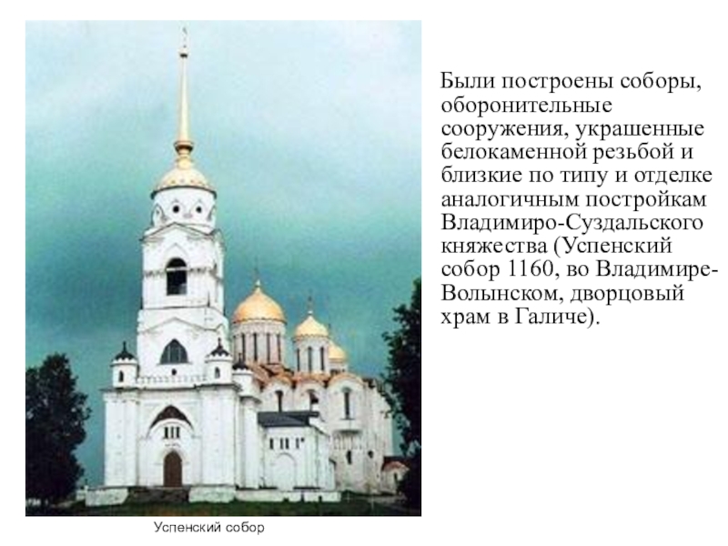 и близкие по типу и отделке аналогичным постройкам Владимиро-Суздальского княжества (Успенский собор 1160, во Владимире-Волынском, дворцовый храм в Галиче).