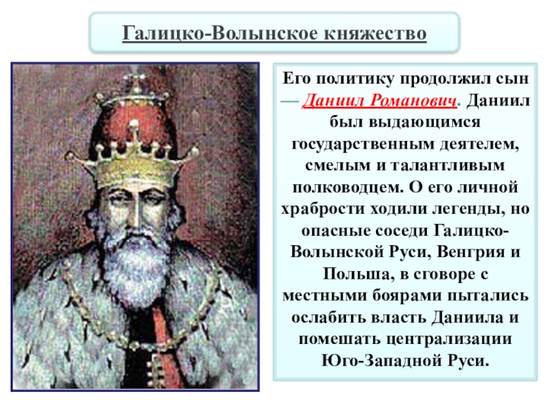 деятелем, смелым и талантливым полководцем. О его личной храбрости ходили легенды, но опасные соседи Галицко-Волынской Руси, Венгрия и Польша, в сговоре с местными боярами пытались ослабить власть Даниила и помешать централизации Юго-Западной Руси.