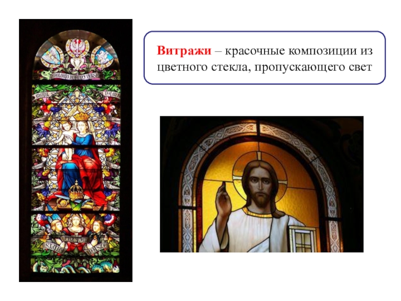 Слайд 64Витражи – красочные композиции из цветного стекла, пропускающего свет