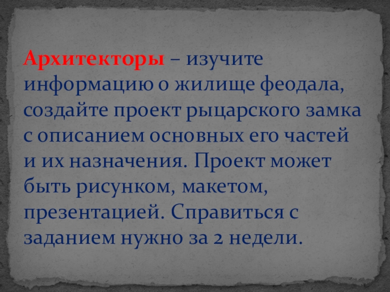 Слайд 4Архитекторы – изучите информацию о жилище феодала, создайте проект рыцарского замка