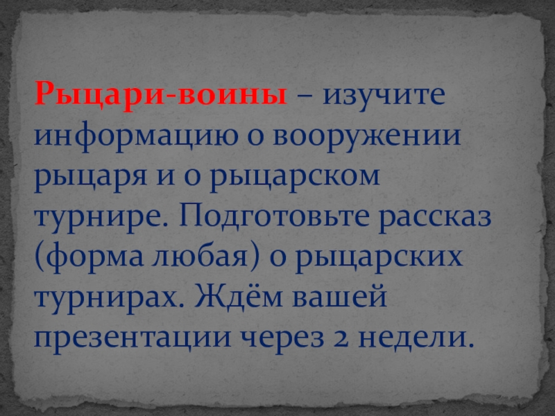 Подготовьте рассказ (форма любая) о рыцарских турнирах. Ждём вашей презентации через 2 недели.