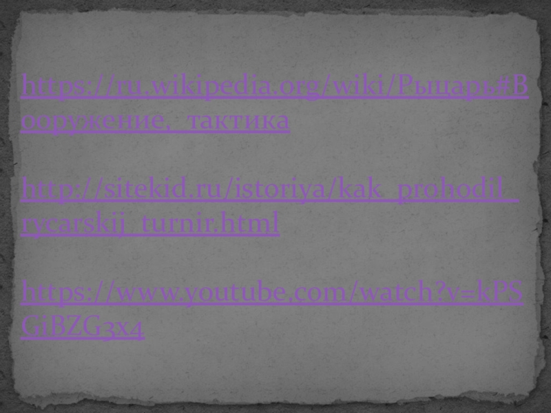 Слайд 7https://ru.wikipedia.org/wiki/Рыцарь#Вооружение,_тактика http://sitekid.ru/istoriya/kak_prohodil_rycarskij_turnir.html https://www.youtube.com/watch?v=kPSGiBZG3x4