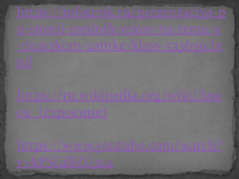 https://infourok.ru/prezentaciya-po-istorii-srednih-vekov-na-temu-v-ricarskom-zamke-klass-533659.html  https://ru.wikipedia.org/wiki/Замок_(строение)  https://www.youtube.com/watch?v=kPSGiBZG3x4