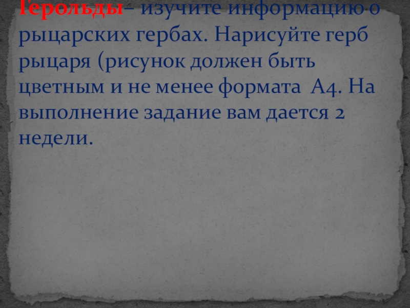 Слайд 8Герольды– изучите информацию о рыцарских гербах. Нарисуйте герб рыцаря (рисунок должен