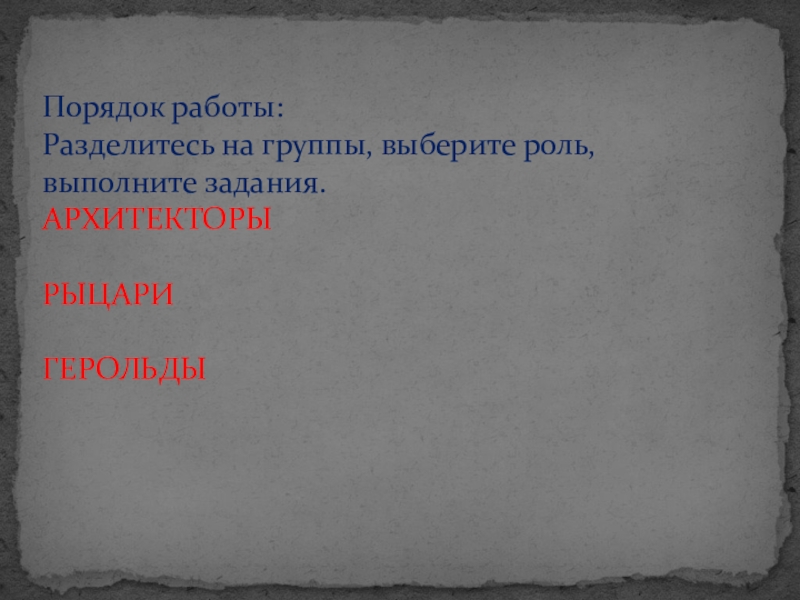 Слайд 3 Порядок работы: Разделитесь на группы, выберите роль, выполните задания. АРХИТЕКТОРЫ РЫЦАРИ ГЕРОЛЬДЫ