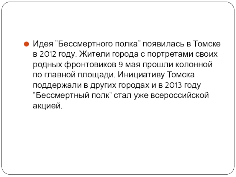 Идея "Бессмертного полка" появилась в Томске в 2012 году. Жители города с портретами своих родных фронтовиков 9 мая прошли колонной по главной площади. Инициативу Томска поддержали в других городах и в 2013 году "Бессмертный полк" стал уже всероссийской акцией.