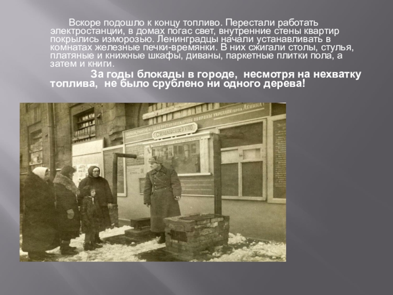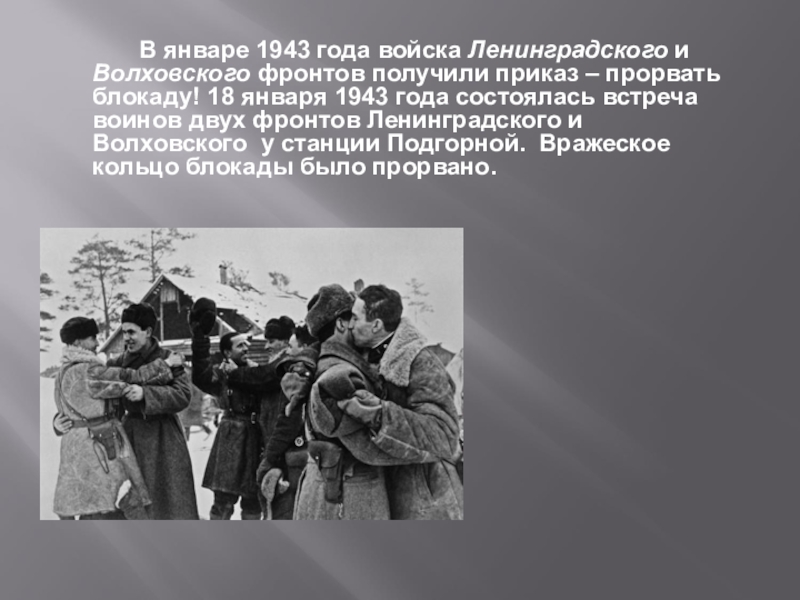 Весь мир узнал, что означают слова «Блокада», «Ладога», «Дорога жизни». Победа нашему народу досталась дорогой ценой. В 2-х млн. городе, окруженном кольцом блокады, людей, родившихся в 1924 – 1926гг. осталось около 2%, а новорожденных 1941-1944гг. еще меньше. Но жертвы были не напрасны. Если бы Ленинград не выстоял, то не выстояла бы и Москва.