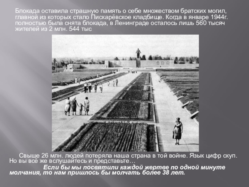 Блокада оставила страшную память о себе множеством братских могил, главной из которых стало Пискарёвское кладбище. Когда в январе 1944г. полностью была снята блокада, в Ленинграде осталось лишь 560 тысяч жителей из 2 млн. 544 тыс