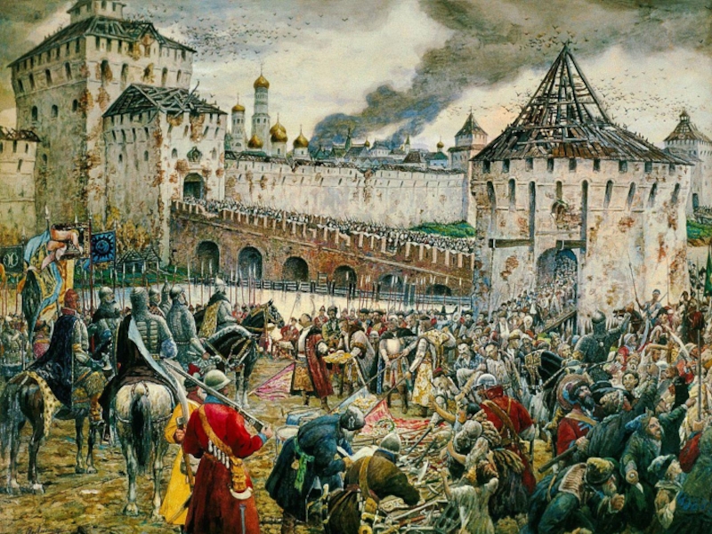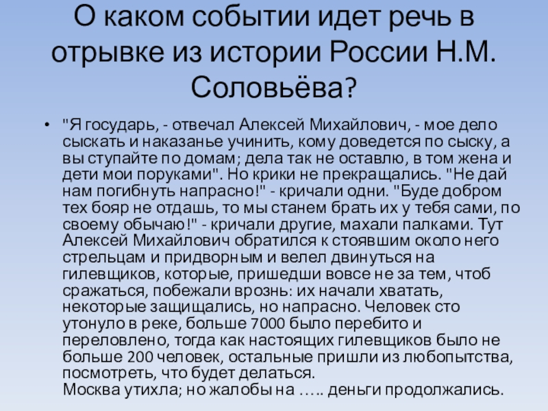 "Я государь, - отвечал Алексей Михайлович, - мое дело сыскать и наказанье учинить, кому доведется по сыску, а вы ступайте по домам; дела так не оставлю, в том жена и дети мои поруками". Но крики не прекращались. "Не дай нам погибнуть напрасно!" - кричали одни. "Буде добром тех бояр не отдашь, то мы станем брать их у тебя сами, по своему обычаю!" - кричали другие, махали палками. Тут Алексей Михайлович обратился к стоявшим около него стрельцам и придворным и велел двинуться на гилевщиков, которые, пришедши вовсе не за тем, чтоб сражаться, побежали врознь: их начали хватать, некоторые защищались, но напрасно. Человек сто утонуло в реке, больше 7000 было перебито и переловлено, тогда как настоящих гилевщиков было не больше 200 человек, остальные пришли из любопытства, посмотреть, что будет делаться.
