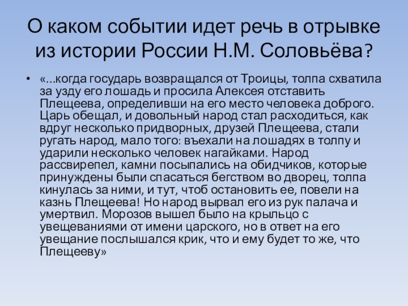 «...когда государь возвращался от Троицы, толпа схватила за узду его лошадь и просила Алексея отставить Плещеева, определивши на его место человека доброго. Царь обещал, и довольный народ стал расходиться, как вдруг несколько придворных, друзей Плещеева, стали ругать народ, мало того: въехали на лошадях в толпу и ударили несколько человек нагайками. Народ рассвирепел, камни посыпались на обидчиков, которые принуждены были спасаться бегством во дворец, толпа кинулась за ними, и тут, чтоб остановить ее, повели на казнь Плещеева! Но народ вырвал его из рук палача и умертвил. Морозов вышел было на крыльцо с увещеваниями от имени царского, но в ответ на его увещание послышался крик, что и ему будет то же, что Плещееву»