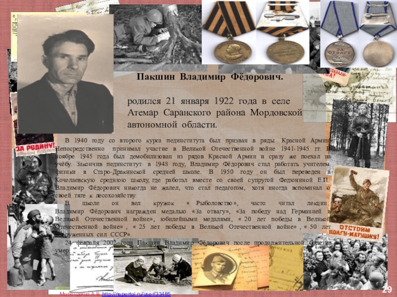В 1940 году со второго курса пединститута был призван в ряды Красной Армии. Непосредственно принимал участие в Великой Отечественной войне 1941-1945 гг. В ноябре 1945 года был демобилизован из рядов Красной Армии и сразу же поехал на учёбу. Закончив пединститут в 1948 году, Владимир Фёдорович стал работать учителем физики в Старо-Дракинской средней школе. В 1950 году он был переведен в Кочелаевскую среднюю школу, где работал вместе со своей супругой Федюниной Е.П. Владимир Фёдорович никогда не жалел, что стал педагогом, хотя иногда вспоминал о своей тяге к лесохозяйству.