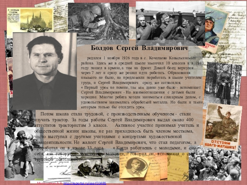 Потом школа стала трудовой, с производственным обучением - стали изучать трактор. За годы работы Сергей Владимирович выдал около 400 аттестатов трактористам 3 класса. Активное участие принимал учитель и общественной жизни школы, не раз приходилось быть членом месткома, часто выступал с другими учителями с концертами художественной самодеятельности. Не жалеет Сергей Владимирович, что стал педагогом, а проработал он в школе 33 года. « Когда работаешь с молодыми, и сам себя, как говорится, чувствуешь моложе», - говорил он, вспоминая о своей трудовой деятельности.