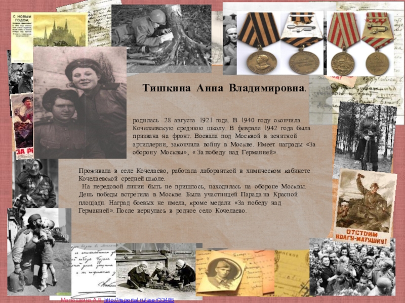 На передовой линии быть не пришлось, находилась на обороне Москвы. День победы встретила в Москве. Была участницей Парада на Красной площади. Наград боевых не имела, кроме медали «За победу над Германией». После вернулась в родное село Кочелаево.