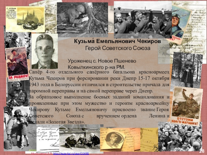 Сапёр 4-го отдельного сапёрного батальона красноармеец Кузьма Чекиров при форсировании реки Днепр 15-17 октября 1943 года в Белоруссии отличился в строительстве причала для паромной переправы и на самой переправе через Днепр.