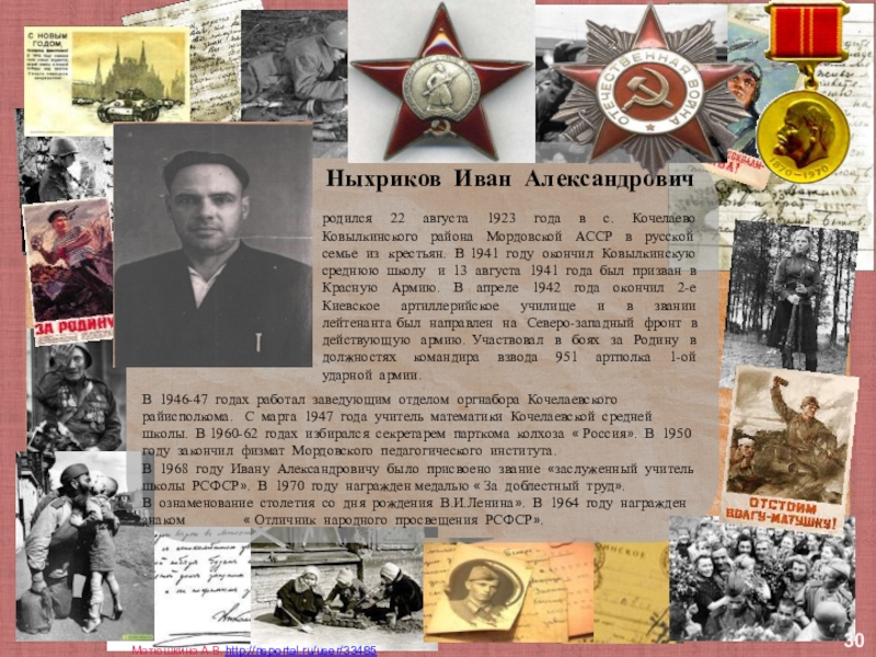 В 1946-47 годах работал заведующим отделом оргнабора Кочелаевского райисполкома. С марта 1947 года учитель математики Кочелаевской средней школы. В 1960-62 годах избирался секретарем парткома колхоза « Россия». В 1950 году закончил физмат Мордовского педагогического института.