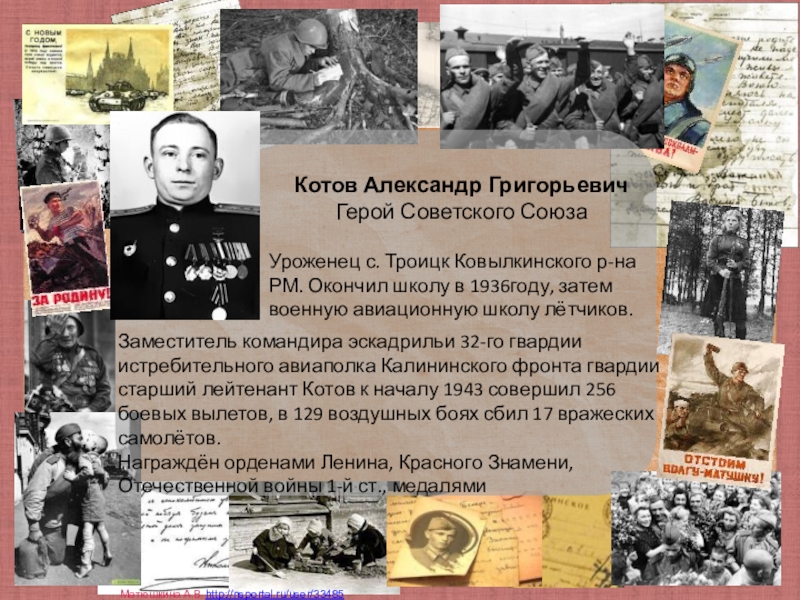 Заместитель командира эскадрильи 32-го гвардии истребительного авиаполка Калининского фронта гвардии старший лейтенант Котов к началу 1943 совершил 256 боевых вылетов, в 129 воздушных боях сбил 17 вражеских самолётов.