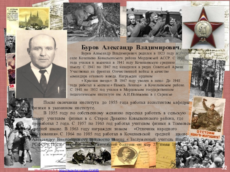 В 1955 году по собственному желанию переехал работать в сельскую школу учителем физики в с. Старое Дракино Ковылкинского района, где проработал 2 года. С 1957 по 1963 год работал учителем физики в Токмовской средней школе. В 1963 году награжден знаком «Отличник народного образования». С 1964 по 1985 год работал в Кочелаевской средней школе. Александру Владимировичу присвоено звание « Заслуженный учитель школы РСФСР». После тяжелой продолжительной болезни он мер 25 июля 1999.