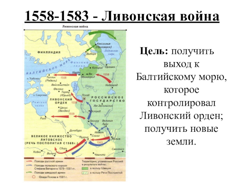 1558-1583 - Ливонская войнаЦель: получить выход к Балтийскому морю, которое контролировал Ливонский орден; получить новые земли.