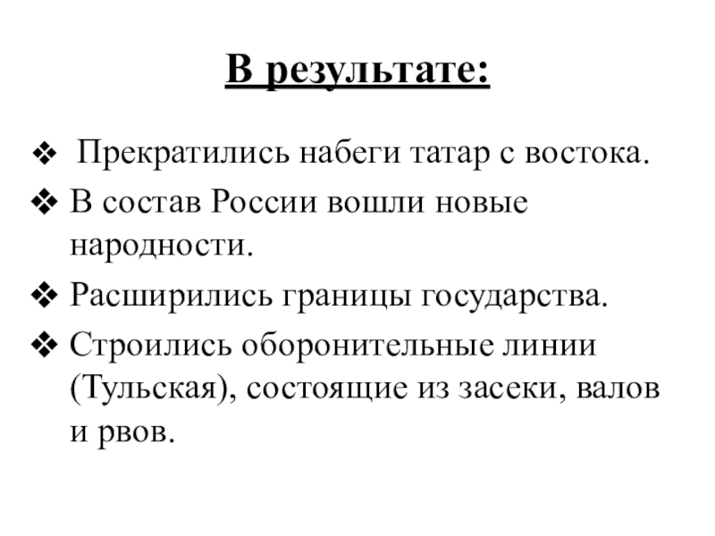 В результате: Прекратились набеги татар с востока.В состав России вошли новые народности.Расширились границы государства.Строились оборонительные линии (Тульская),