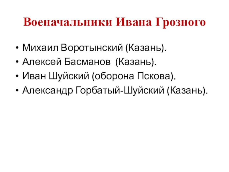 Военачальники Ивана ГрозногоМихаил Воротынский (Казань).Алексей Басманов  (Казань).Иван Шуйский (оборона Пскова).Александр Горбатый-Шуйский (Казань).
