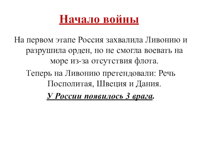 Начало войныНа первом этапе Россия захвалила Ливонию и разрушила орден, но не смогла воевать на море из-за