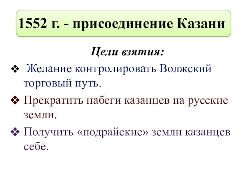 1552 г. - присоединение КазаниЦели взятия: Желание контролировать Волжский торговый путь.Прекратить набеги казанцев на русские земли.Получить «подрайские»