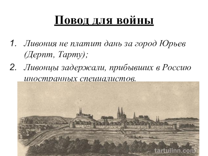 Повод для войныЛивония не платит дань за город Юрьев (Дерпт, Тарту);Ливонцы задержали, прибывших в Россию иностранных специалистов.