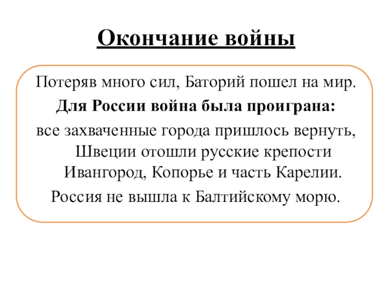 Окончание войныПотеряв много сил, Баторий пошел на мир. Для России война была проиграна: все захваченные города пришлось