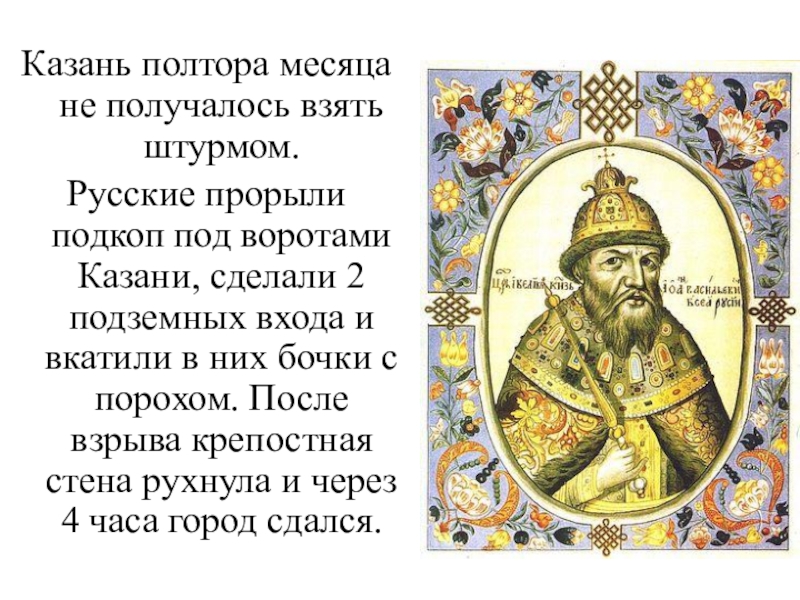Казани, сделали 2 подземных входа и вкатили в них бочки с порохом. После взрыва крепостная стена рухнула и через 4 часа город сдался.