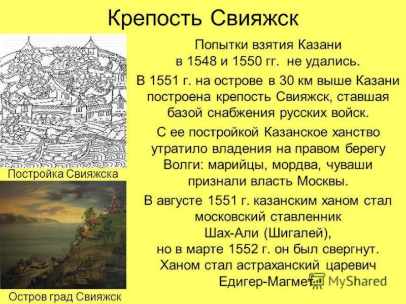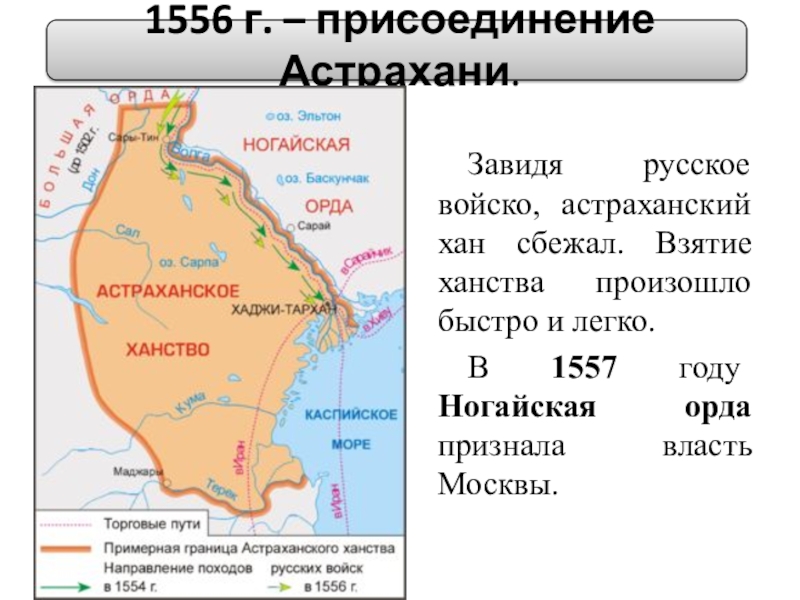 1556 г. – присоединение Астрахани.Завидя русское войско, астраханский хан сбежал. Взятие ханства произошло быстро и легко. В