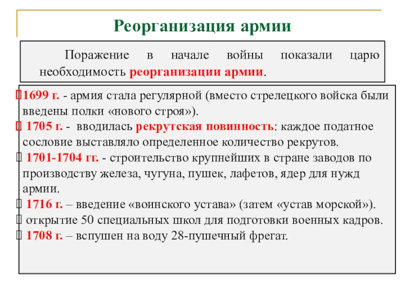 1699 г. - армия стала регулярной (вместо стрелецкого войска были введены полки «нового строя»).