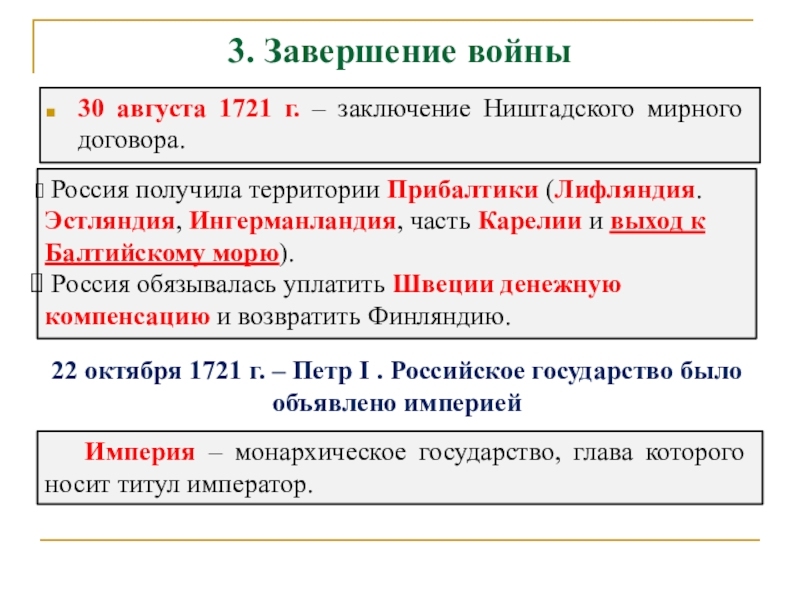 Россия получила территории Прибалтики (Лифляндия. Эстляндия, Ингерманландия, часть Карелии и выход к Балтийскому морю).