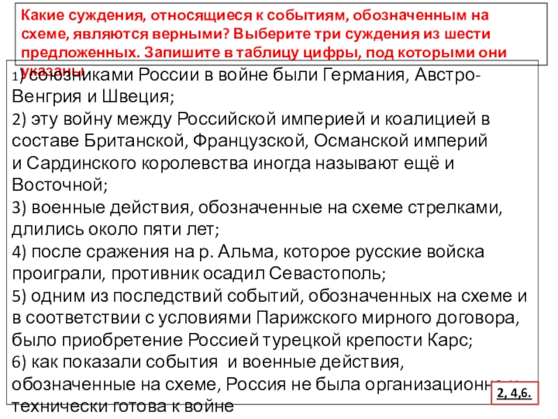 5) одним из последствий событий, обозначенных на схеме и в соответствии с условиями Парижского мирного договора, было приобретение Россией турецкой крепости Карс;