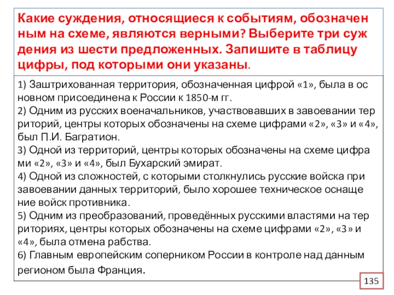 5) Одним из преобразований, проведённых русскими властями на территориях, центры которых обозначены на схеме цифрами «2», «3» и «4», была отмена рабства.