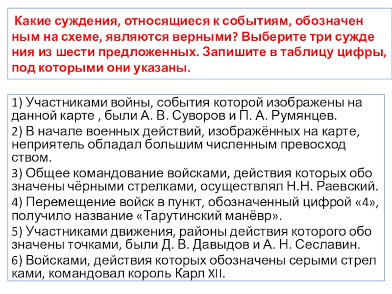 6) Войсками, действия которых обозначены серыми стрелками, командовал король Карл XII.