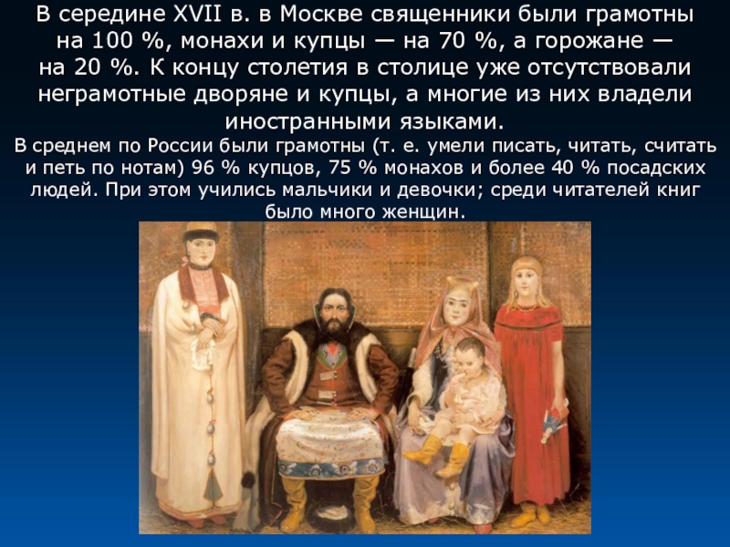 В среднем по России были грамотны (т. е. умели писать, читать, считать и петь по нотам) 96 % купцов, 75 % монахов и более 40 % посадских людей. При этом учились мальчики и девочки; среди читателей книг было много женщин.