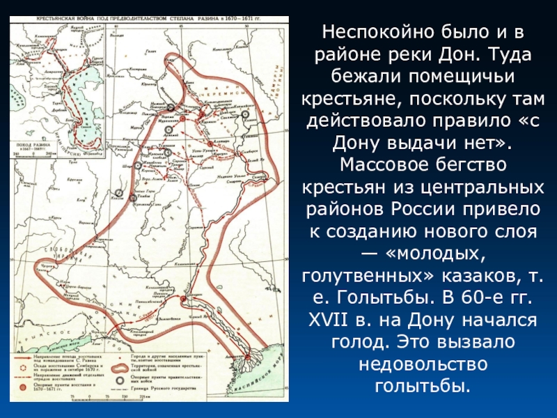 поскольку там действовало правило «с Дону выдачи нет». Массовое бегство крестьян из центральных районов России привело к созданию нового слоя — «молодых, голутвенных» казаков, т. е. Голытьбы. В 60-е гг. XVII в. на Дону начался голод. Это вызвало недовольство