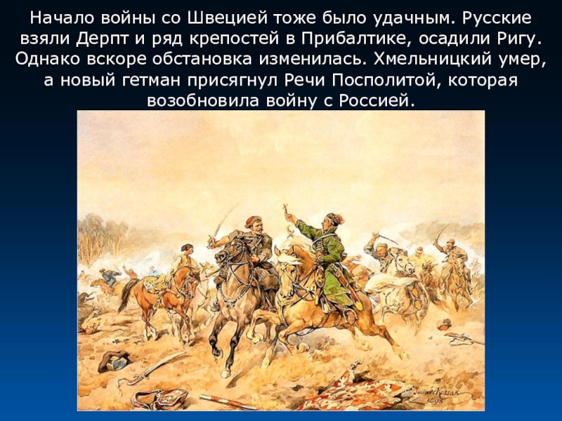 ряд крепостей в Прибалтике, осадили Ригу. Однако вскоре обстановка изменилась. Хмельницкий умер, а новый гетман присягнул Речи Посполитой, которая возобновила войну с Россией.