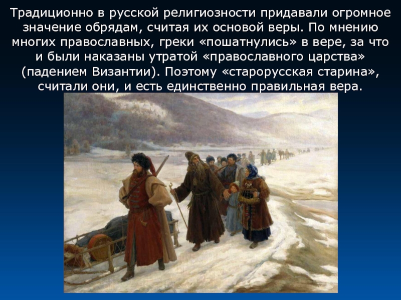 веры. По мнению многих православных, греки «пошатнулись» в вере, за что и были наказаны утратой «православного царства» (падением Византии). Поэтому «старорусская старина», считали они, и есть единственно правильная вера.